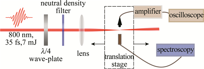 實驗裝置如圖 1所示,以獲得飛秒激光成絲過程中的熒光輻射光譜和聲音信號。實驗中采用的飛秒激光器型號為Astrella(Coherent, Inc.),該系統可輸出中心波長為800 nm、脈沖時間寬度為35 fs、單脈沖較大能量為7 mJ、重復頻率為1 Hz~1000 Hz可調的線偏振激光脈沖。激光器發射出的重復頻率為1000 Hz的激光經過λ/4波片、中性密度濾光片后,被焦距為40 cm的透鏡聚焦,在空氣中產生光絲。在光絲的垂直方向上由光纖將熒光信號引入光譜儀,測量光絲的熒光光譜。光譜儀型號為USB4000(Ocean Optics, Inc.),光譜每次測量的積分時間為1.5 s,平均次數為5次??刂齐妱游灰婆_使組裝在其上面的光纖探頭沿激光傳播方向移動,以獲得等離子體光絲不同位置處的熒光信號。轉動波片控制激光的偏振態實現由線偏振到圓偏振的演化。調節中性密度濾光片可連續改變激光脈沖能量,以獲得不同激光脈沖能量下的熒光信號。測量過程中以熒光信號出現的位置為等離子體光絲傳輸的零點,位移臺每移動1 mm收集一次信號,直至熒光信號消失。
