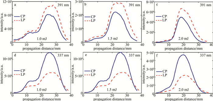 沿著光的傳播方向移動光纖探頭,可以測量飛秒光絲不同位置處的熒光信號。如圖 3所示,為入射激光能量分別為1.0 mJ,1.5 mJ和2.0 mJ時,激光的偏振態分別為線偏振和圓偏振情況下,測量得到391 nm處的N2+熒光信號強度和337 nm處的N2熒光信號強度隨光傳輸距離的變化??梢园l現,在3種不同的入射激光能量下,光絲中心位置處337 nm的熒光信號在圓偏振光作用下的強度約為線偏振態下的2倍,而391 nm的熒光信號則是在線偏振態下的強度約為圓偏振光下的1.3倍。隨著入射激光單脈沖能量的增加,熒光強度的較大值在逐漸增加。