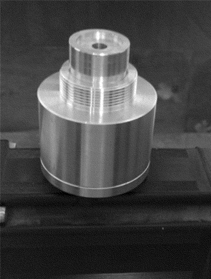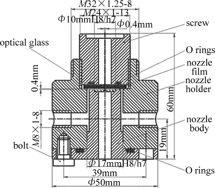 耦合裝置是實(shí)現(xiàn)激光與微水束耦合并傳輸?shù)年P(guān)鍵部件。耦合裝置主要由噴嘴體、進(jìn)水孔、O型圈、噴嘴支架等組成,如圖 2所示。本文中將噴嘴設(shè)計(jì)成圓柱形,目的是為了延長(zhǎng)微水束的破碎長(zhǎng)度。考慮到激光的能量密度比較大,且激光要在噴嘴內(nèi)部發(fā)生全反射,故噴嘴材料選用耐熱性比較好的銅。各參量具體數(shù)值為:噴嘴長(zhǎng)度為10mm,噴嘴直徑為0.4mm,耦合間隙為0.4mm。噴嘴體頂部的定位圓柱體6與噴嘴支架4通過螺紋連接,高壓水從左右兩側(cè)的注水口注入耦合裝置,并進(jìn)入噴嘴體與光學(xué)玻璃之間形成的耦合間隙,然后通過噴嘴片上的噴嘴將耦合之后的光液高能束噴射出來。圖 3為耦合裝置的實(shí)物照片。