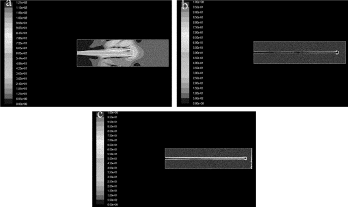 經(jīng)光液耦合后的水束噴射到空氣中的情況是比較復(fù)雜的。水束會(huì)在噴口處發(fā)生縮流,水束會(huì)突然縮小為原來的80%,然后水束在空氣壓力的作用下,其直徑又慢慢變大,最終導(dǎo)致激光束從水束中逃逸。噴嘴口的大小和水束的流速均會(huì)影響噴射流長(zhǎng)度,本次仿真選取水束壓力為20MPa,依次對(duì)0.3mm, 0.4mm及0.5mm 3種口徑噴嘴射出的水束穩(wěn)定性進(jìn)行仿真,如圖 7所示。本次仿真設(shè)置的邊界為100mm。
