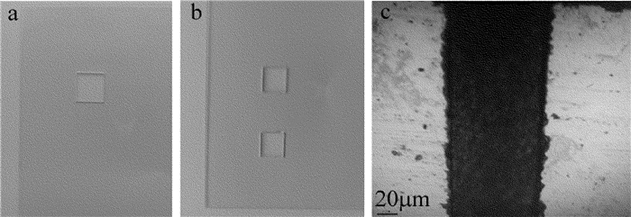 (2) 在噴口口徑為0.4mm、水束壓力為20MPa、激光功率為48W、切割速率為20mm/s時(shí)進(jìn)行玻璃的微水導(dǎo)激光切割。厚度為0.5mm及1.0mm的玻璃試樣的切割表面均比較光滑、基體內(nèi)無微裂紋存在,切縫寬度約為100μm,但1.0mm厚的玻璃試樣切割邊緣有毛刺及崩邊現(xiàn)象出現(xiàn)。