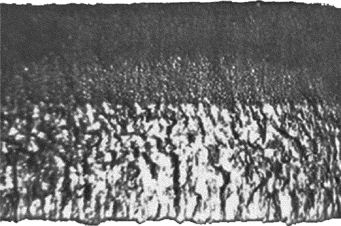 圖 7為不同頻率下縫寬和錐度的變化曲線。其中激光功率20W,切割速率30mm/min,脈沖頻率分別為30Hz, 40Hz, 50Hz, 60Hz。從圖中看出,激光脈沖頻率對切縫寬度影響大。隨著頻率的增大,縫寬顯著減小,同時切割錐度也隨之減小。脈沖頻率的大小決定著激光光斑的重疊程度,圖 8為PCBN激光切割、掰片、簡單去熔渣后斷面形貌圖。上層為PCBN,下層為硬質合金。圖中能明顯看出切割后的條紋形狀。根據單脈沖激光能量E與平均輸出功率Pave和脈沖頻率f的關系式E=Pave/f可知,隨著脈沖頻率的增加,單脈沖能量減小,光斑重疊度增大,這對表面切割質量的提高和裂紋的減少起著重要作用。