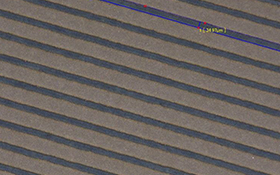 玻璃/薄膜表面氧化銦錫(ITO)、FTO、銀漿(Ag)、碳納米管(CNT)、石墨烯、納米銀、鉬鋁鉬、銅、高分子導電膜、鋁薄膜、PERC、鈣鈦礦電池、TCO、碳粉、氧化鋯、氧化鈦、氧化鋅、金等涂層材料的超細線寬激光蝕刻??芍苯訉Π撞AЪす饪涛g、劃線,最小線寬小于10微米。
